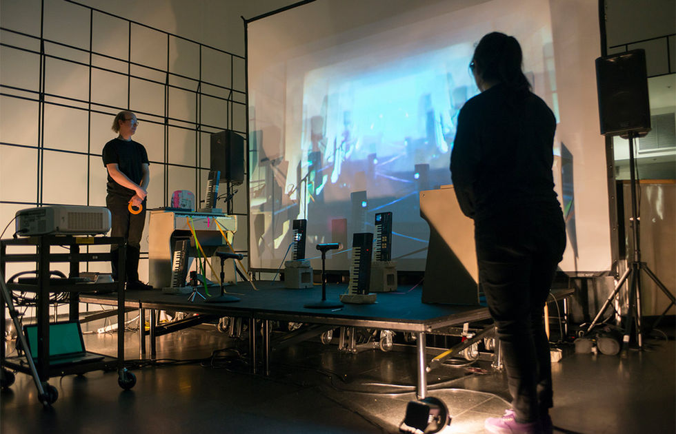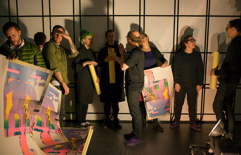 Dubbing Stills was envisioned as a series of performative images that coupled our exploratory graphic practice with improvised music and live projection. Created in real time, line, timbre, and action merged to form an ephemeral viewing and listening experience. In addition to the performance, we provided the audience with a takeaway poster, condensing the fleeting nature of the performance into a static moment. This one-time performance was a step into completely new terrain for us—a place where 2-D and 3-D expression were tangled up into an inseparable knot.